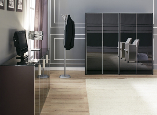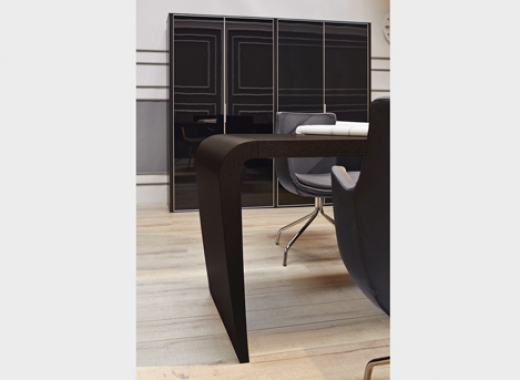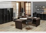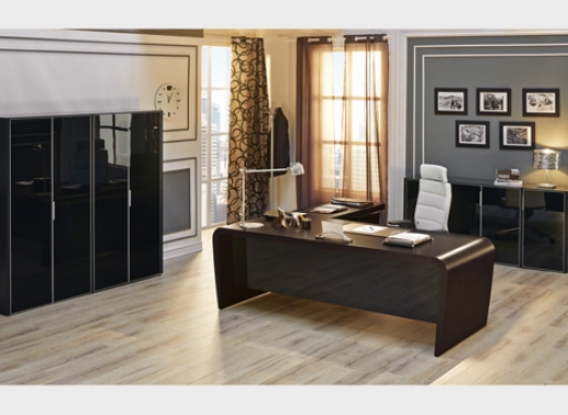 Оригинальный дизайн и пластичность форм выгодно отличают кабинет DALI. Массивная столешница письменного стола плавно переходит в опоры, зауженные к основанию. Шкаф представляет собой композицию из шкафа для бумаг (90см) и гардероба (60см+30см), под верхнюю одежду отведена бόльшая часть гардеробной секции. Стеклянные двери шкафов и греденций обрамлены в алюминиевую рамку и оснащены системой плавного закрывания. Стеклянные топы добавляют изюминку и лоск в общее восприятие кабинета DALI.Технические характеристики