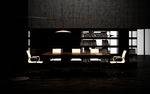 Конференц-стол на опорах из закалённого стекла состоит из двух модулей GS-2. Визуальная толщина столешницы — 120 мм (декоративная обкладка торцов), толщина стекла опор — 10 мм.