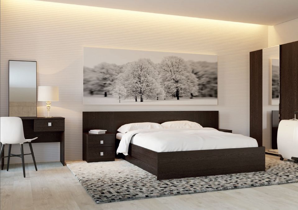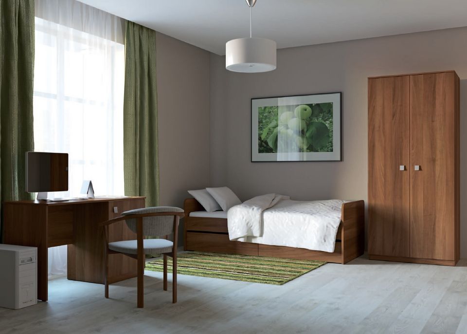 - Кровати разной вместимости (односпальные, двуспальные, тахты, двухярусные кровати) позволяют комплектовать разнообразные по площади помещения не только гостиничных номеров, но и пансионатов, хостелов и общежитий.